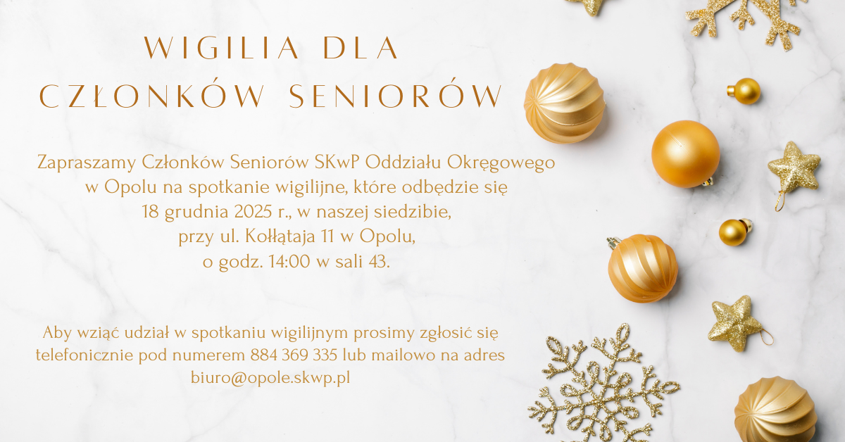 Serdecznie zapraszamy Członków Seniorów SKwP Oddziału Okręgowego w Opolu na spotkanie wigilijne, które odbędzie się 18 grudnia 2025 r., w naszej siedzibie, przy ul. Kołłątaja 11 w Opolu, o godz. 14:00 w sali 43.