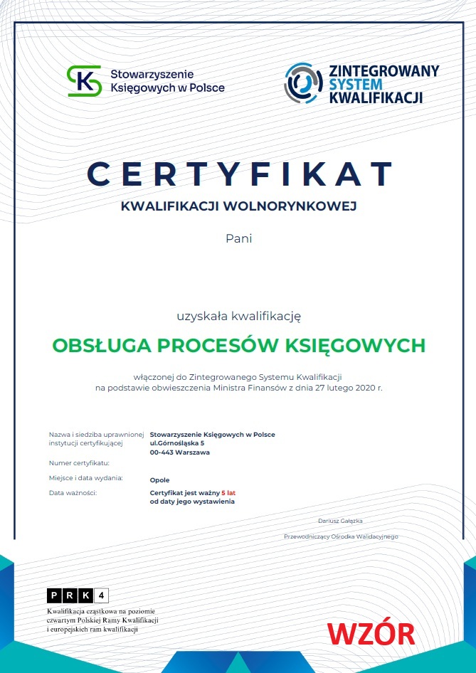 - certyfikat potwierdzający wiedzę, umiejętności i kompetencje społeczne wymagane dla kwalifikacji wolnorynkowej "Obsługa procesów księgowych"”, która wpisana jest do rejestru kwalifikacji na podstawie ustawy z dnia 22 grudnia 2015 r. o Zintegrowanym Systemie Kwalifikacji (t.j. Dz. U. z 2020 roku poz. 226 ze zm.) - WZÓR DOKUMENTU