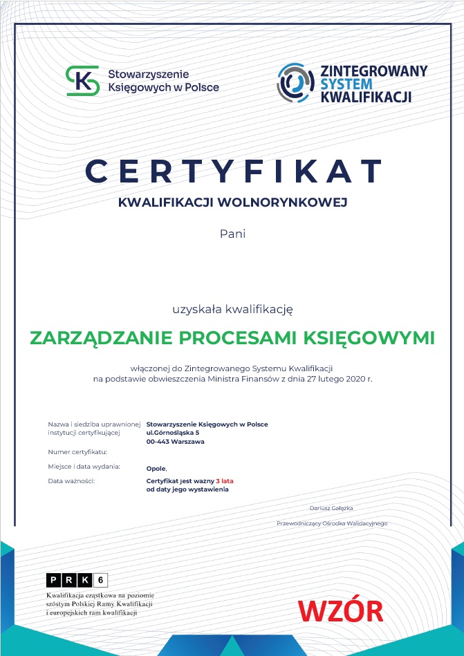 - certyfikat potwierdzający wiedzę, umiejętności i kompetencje społeczne wymagane dla kwalifikacji wolnorynkowej „Zarządzanie procesami księgowymi” , która wpisana jest do rejestru kwalifikacji na podstawie ustawy z dnia 22 grudnia 2015 r. o Zintegrowanym Systemie Kwalifikacji (t.j. Dz. U. z 2020 roku poz. 226 ze zm.) - WZÓR DOKUMENTU
