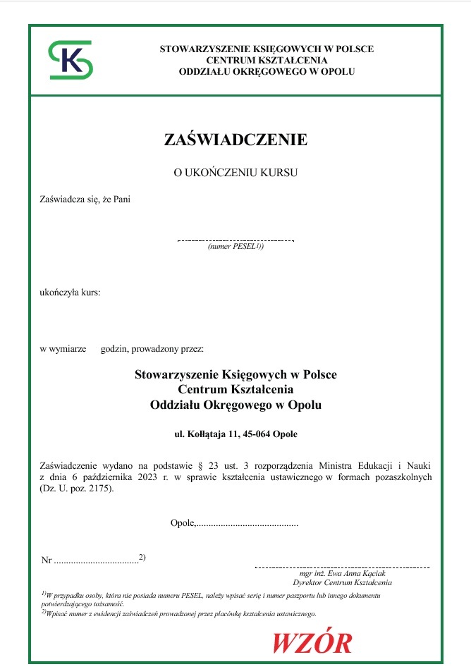 - zaświadczenie o ukończeniu kursu na podstawie§ 23 ust. 3 rozporządzenia Ministra Edukacji i Nauki z dnia 6 października 2023 r. w sprawie kształcenia ustawicznego w formach pozaszkolnych (Dz. U. poz. 2175) - WZÓR DOKUMENTU